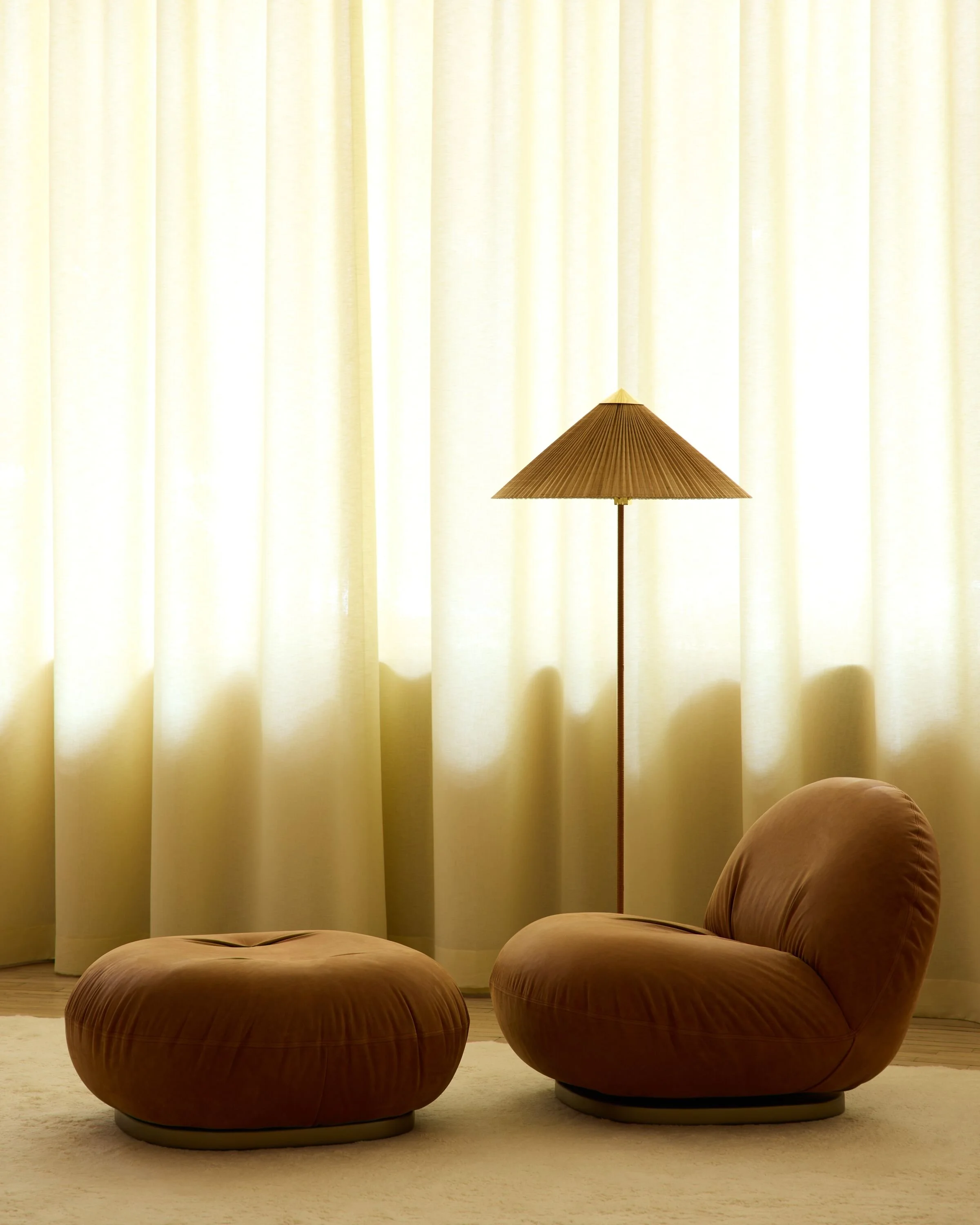 DWR wanted a warm, textured backdrop for their NYC x Design event featuring GUBI’s reintroduction of the iconic F300 chair by Pierre Paulin. We installed two sets of custom track in their SoHo location: a ceiling-mounted track along the front windows, and a suspension track with a custom bend at the corner for a seamless look. Using an airy fabric, we made double-sided S-fold curtains with double fullness for a beautiful ripple. The pale-yellow fabric filtered sunlight through the storefront, filling the space with a warm amber glow.
