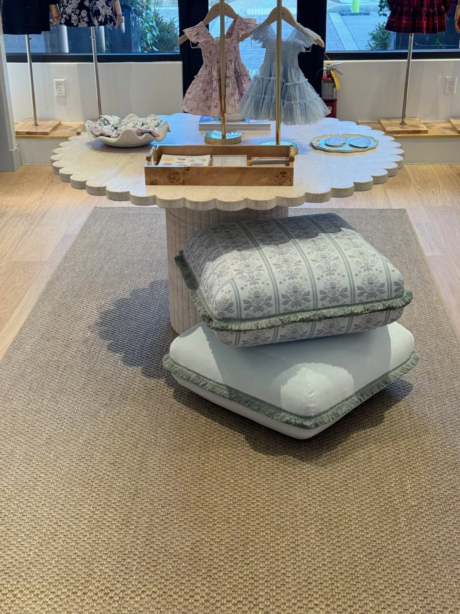 The tailored drapery and valances frame each threshold with a sense of charm and intention, carrying the store’s delicate florals and soft blues throughout the space. Coordinating pillows and upholstered seating add comfort and cohesion, giving visitors a place to pause within the beautifully layered environment.