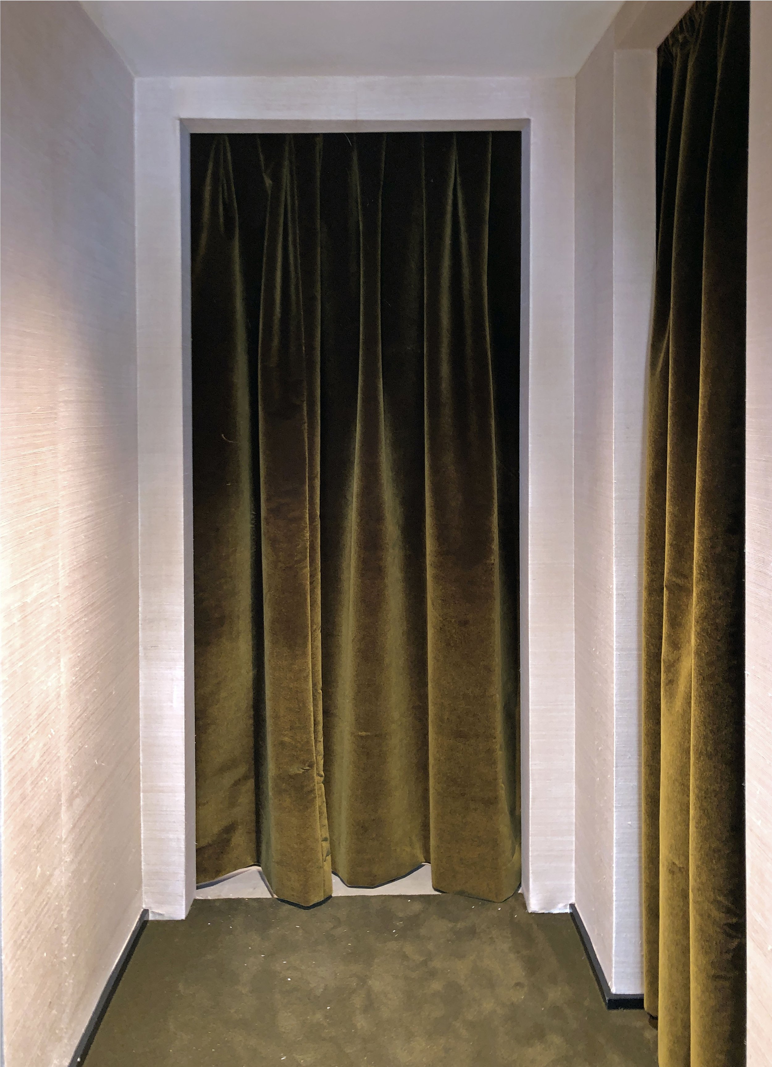The velvet panels serve a functional purpose, fully blacking out the windows to create a cocoon-like environment even in daylight. Their weight, color, and texture deepen the monochromatic palette and help the room shift in tone as the evening unfolds.
